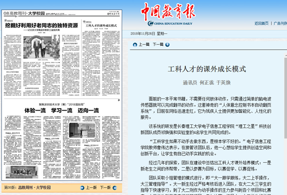 首頁» 關于理工» 媒體理工» 【媒體理工】《中國教育報》報道我校“意念翻書”背后的故事 發布日期:2018-11-30 閱讀次數: 次 近日,在我校電子信息工程學院舉行的“新電感應”電子科技展活動中,一套名為“人體意念控制書本自動翻頁系統”的作品受到《人民日報》、新華社等多家主流媒體的廣泛關注和報道。 11月26日,《中國教育報》“高教周刊”刊登了黨委宣傳部部長、新聞中心主任于英煥,工作人員何正瀧撰寫的文章《工科人才的課外成長模式》,詳細報道了“意念翻書”背后的故事。 相關鏈接: http://paper.jyb.cn/zgjyb/html/2018-11/26/content_509510.htm?div=-1 (供稿:黨委宣傳部 新聞中心 撰稿:李夢童 審核:于英煥 編輯:李夢童)