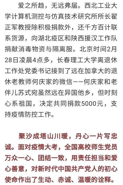 文中提及,我校退休校領導何慶家和老伴兒蘇式宛雖然遠在異國他鄉,但時刻心系祖國,共同捐款5000元,支持祖國疫情防控工作。他們用實際行動對新時代中國共產黨人的初心使命作出了生動、赤誠、溫暖的詮釋。