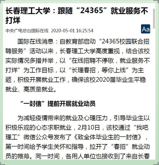 5月1日,中央廣電總臺國際在線頻道以“長春理工大學(xué):跟隨‘24365’ ,就業(yè)服務(wù)不打烊”為題,從“一封信”提前開展就業(yè)動員、“一平臺”實現(xiàn)在線全程就業(yè)、“一對一”提供精準(zhǔn)就業(yè)幫扶、“一推廣”鼓勵學(xué)生留省就業(yè)四個方面,對我校在新冠肺炎疫情防控期間開展精細(xì)化就業(yè)服務(wù)工作進(jìn)行了詳細(xì)報道。