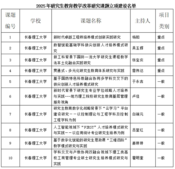 近日,吉林省教育廳公布了第四批省級研究生精品示范課程、專業學位研究生教學案例和2025年研究生教育教學改革研究課題立項建設名單。我校獲批研究生精品示范課程立項建設項目4項、教學案例立項建設項目4項、研究生教育教學改革研究課題建設項目10項。
