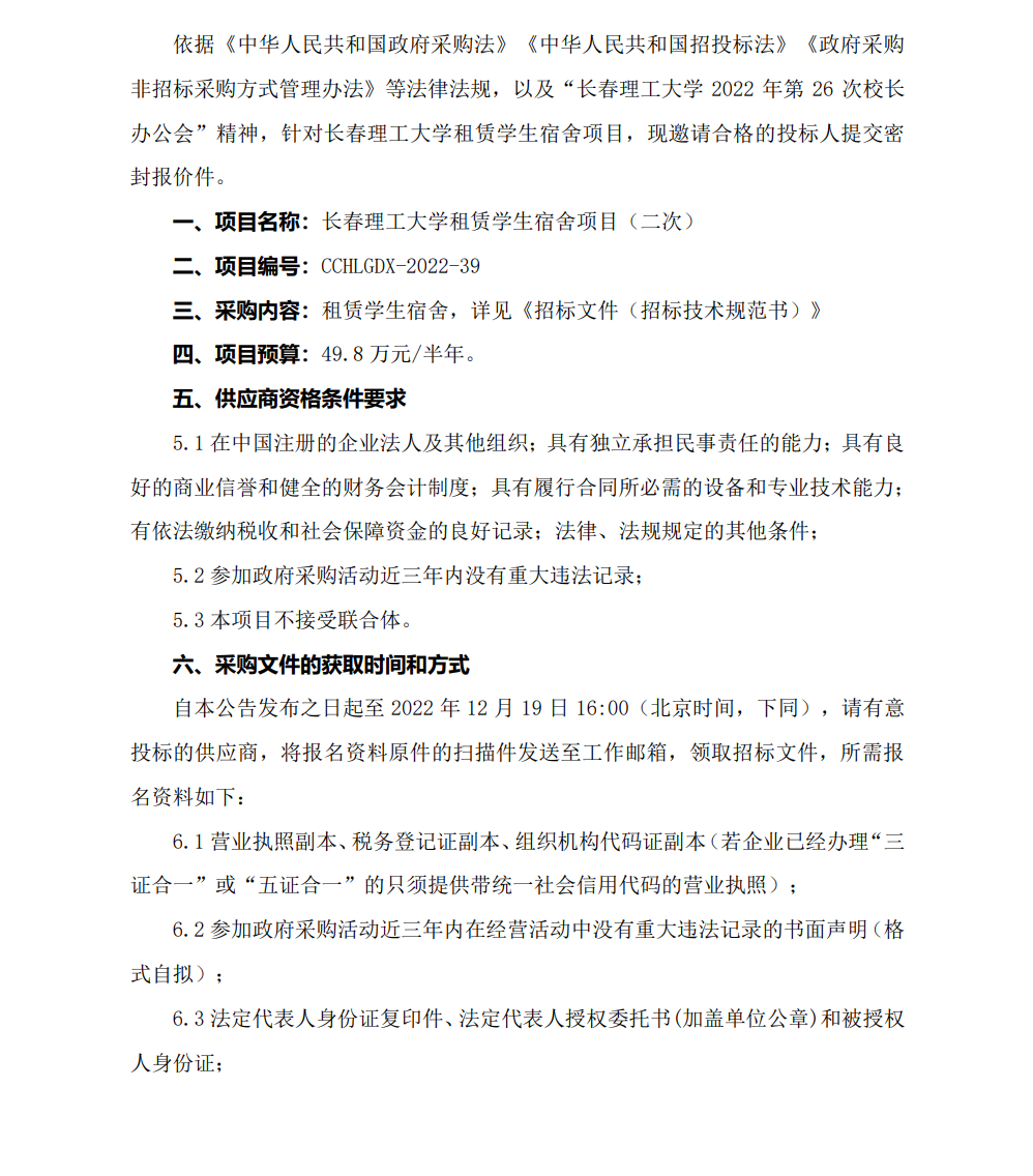 長春理工大學租賃學生宿舍項目(二次)招標公告
