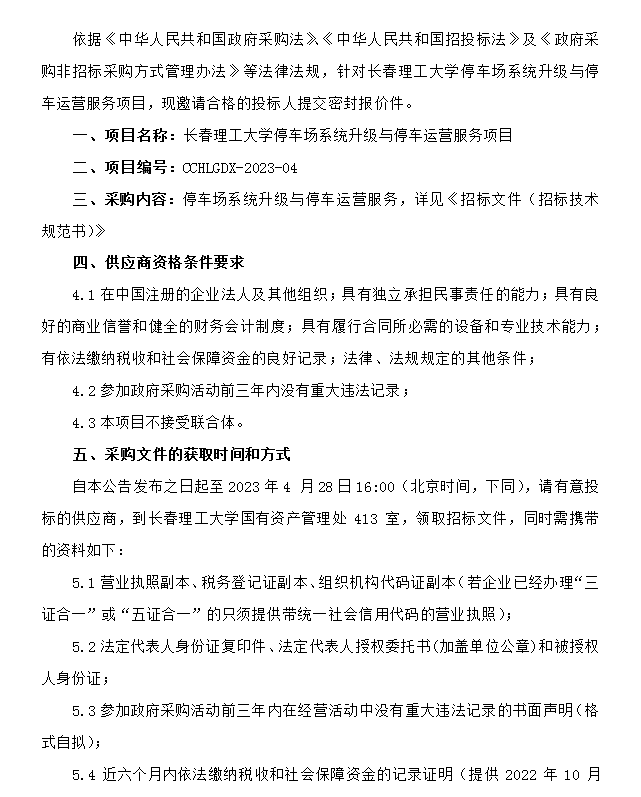 長春理工大學停車場系統升級與停車運營服務項目競爭性磋商公告
