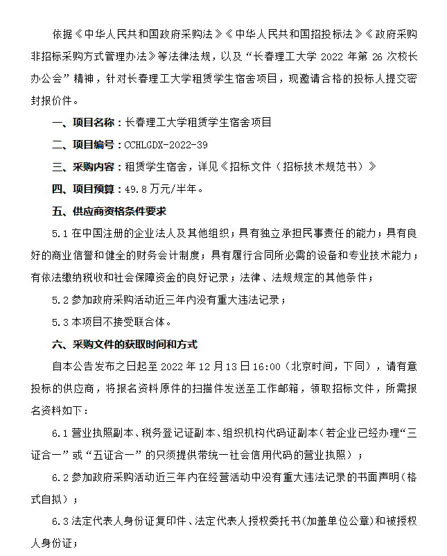 長春理工大學租賃學生宿舍項目招標公告