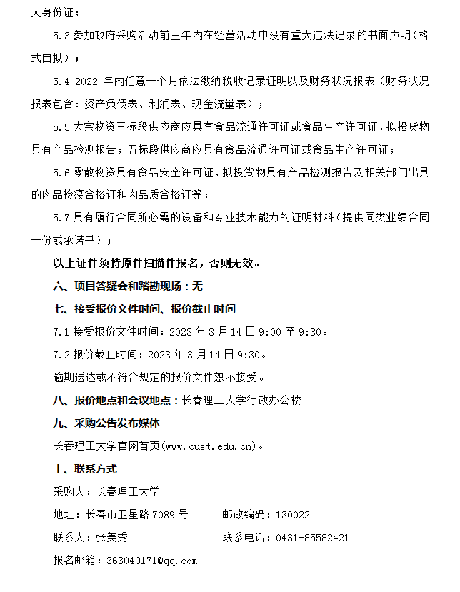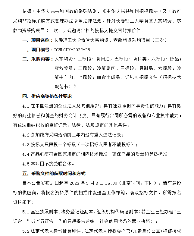 長春理工大學食堂大宗物資、零散物資采購項目(二次)招標公告