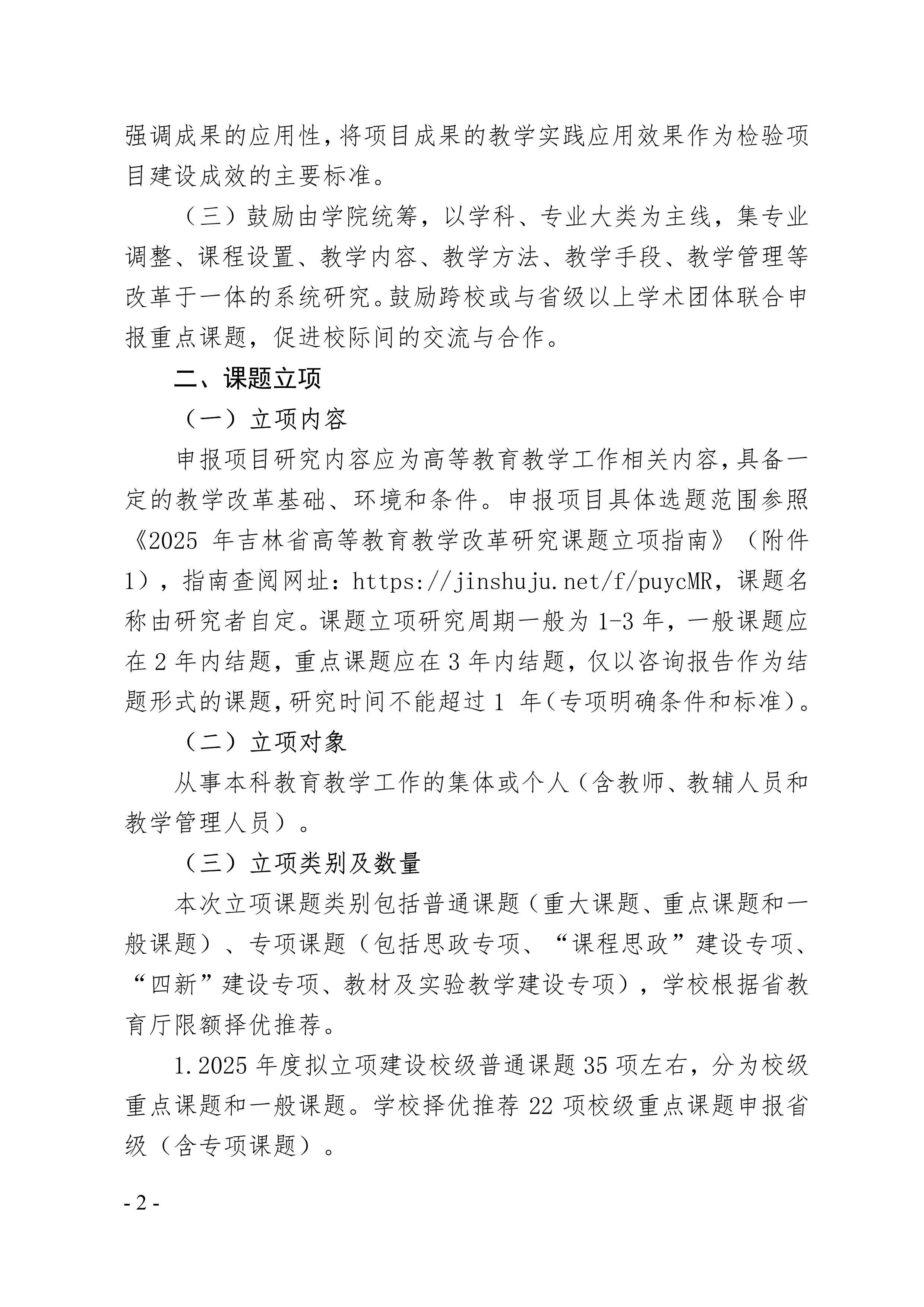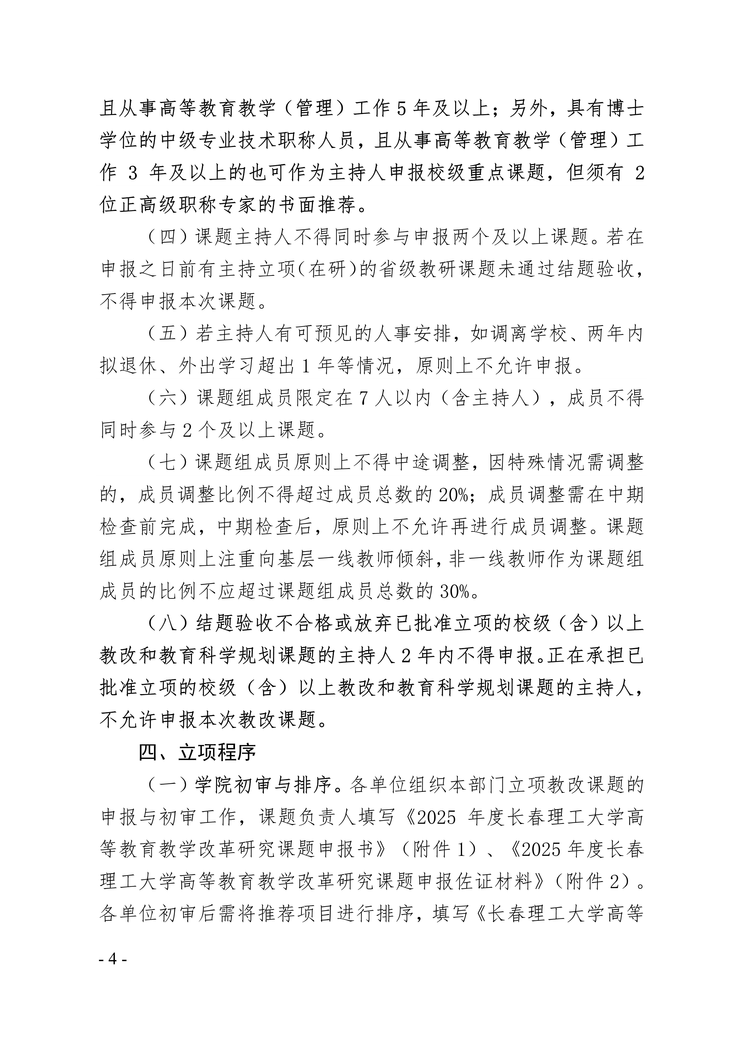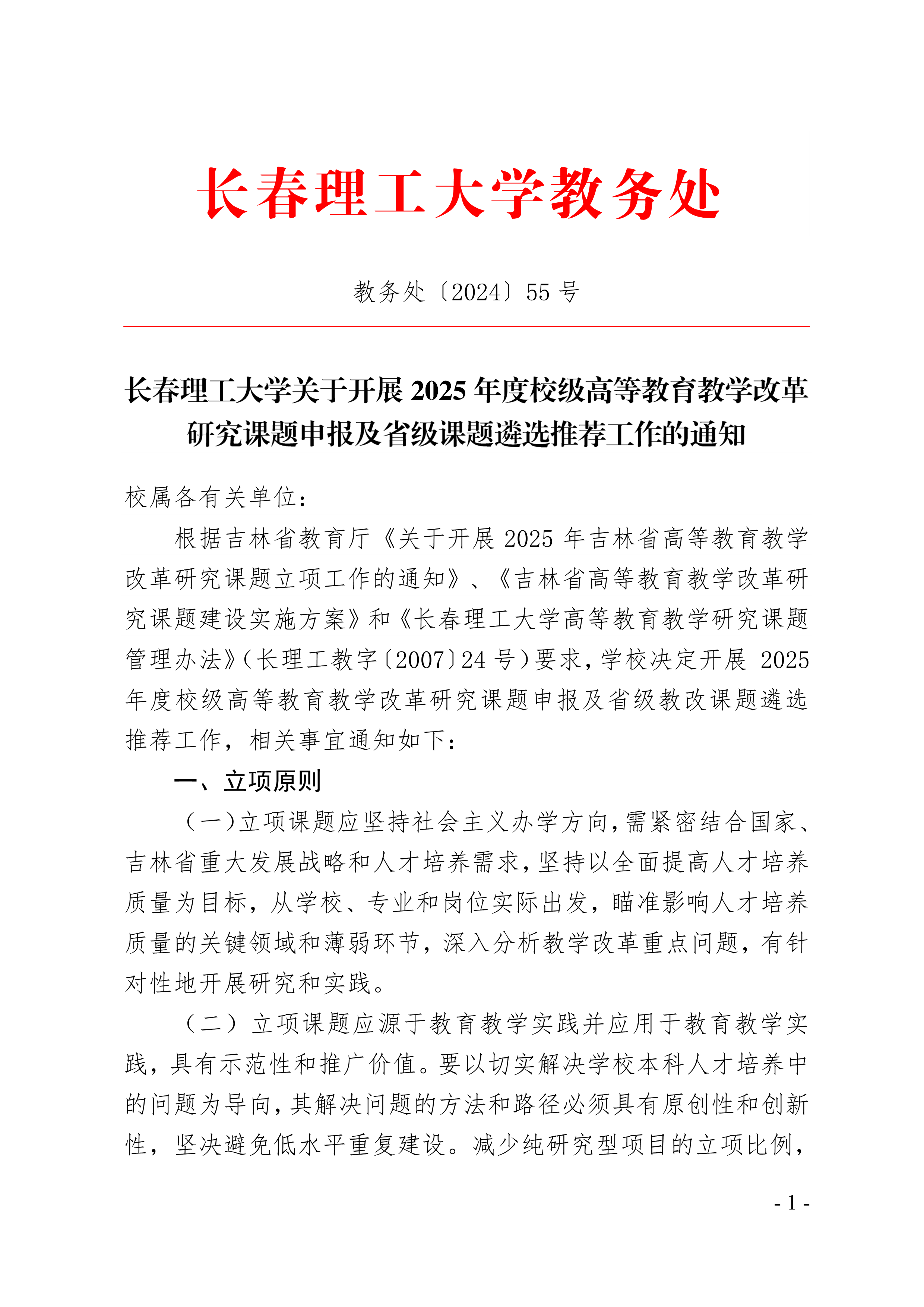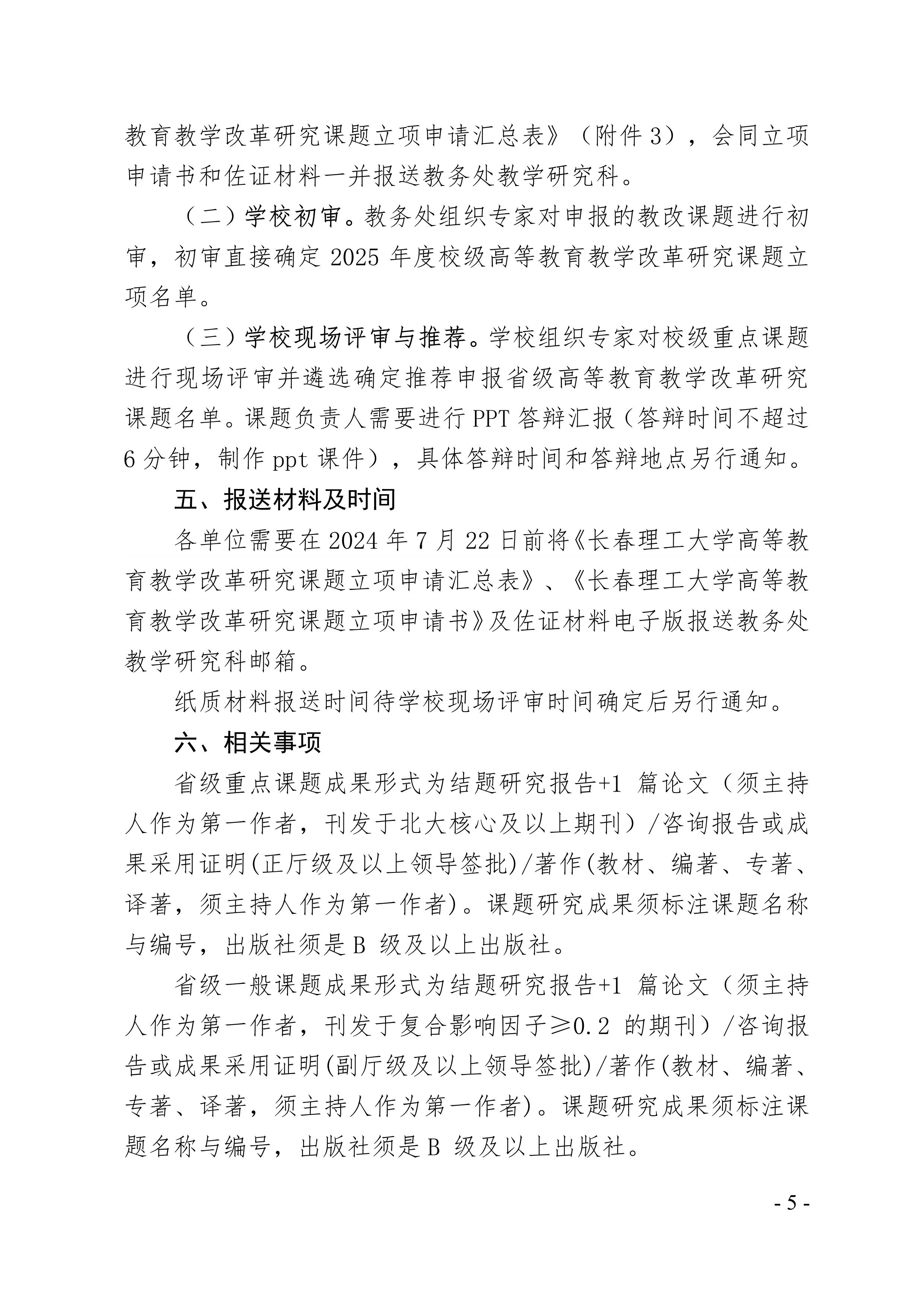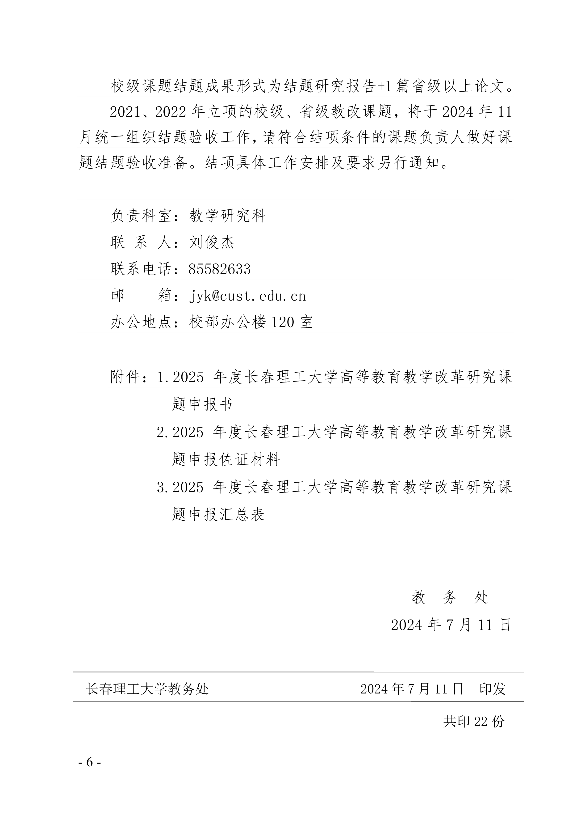 首頁» 通知公告» 長春理工大學關于開展2025年度校級高等教育教學改革研究課題申報及省級課題遴選推薦工作的通知 發布日期:2024-07-12 閱讀次數: 次 相關附件 附件1:2025年度長春理工大學高等教育教學改革研究課題申報書.doc 附件2:2025年度長春理工大學高等教育教學改革研究課題申報佐證材料(模板).doc 附件3:2025年長春理工大學高等教育教學改革研究課題立項申報匯總表.xlsx