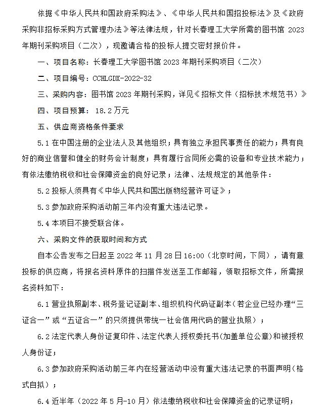 長春理工大學圖書館2023年期刊采購項目(二次)競爭性談判公告